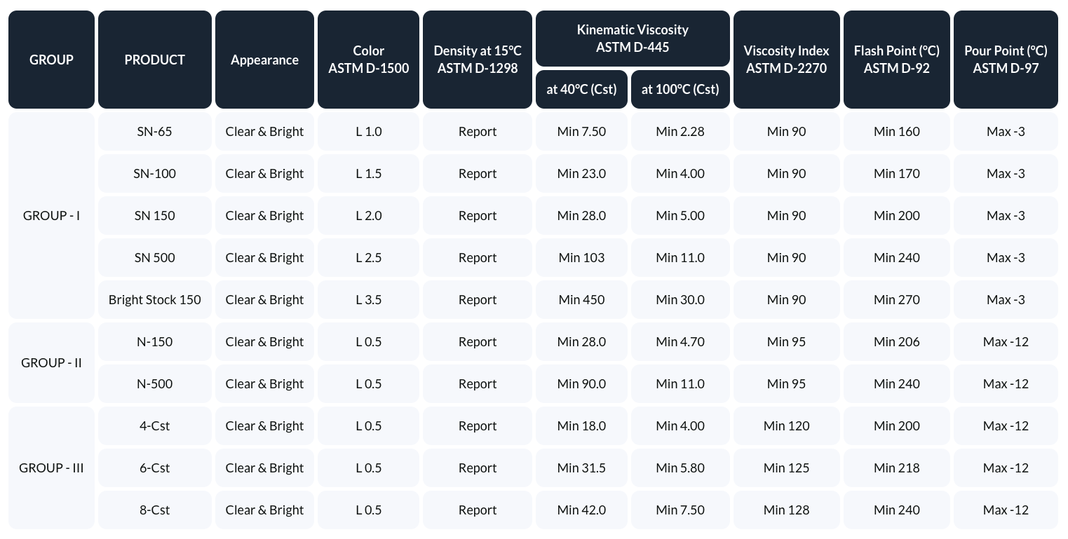 | GROUP | PRODUCT | Appearance | Color ASTM D-1500 | Density at 15°C ASTM D-1298 | Kinematic Viscosity ASTM D-445 | Viscosity Index ASTM D-2270 | Flash Point (°C) ASTM D-92 | Pour Point (°C) ASTM D-97 | |
